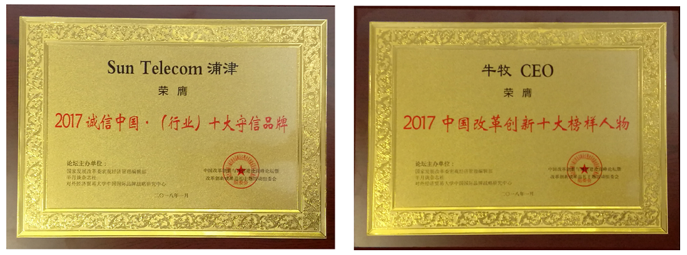 On Jan. 19th 2018, Sun Telecom was awarded as the honorary title of "Trustworthy Brand (Industry) 2017" in Innovation and Integrity Construction Summit 2018 in Beijing, China. And CEO Caesara Niu won the honorary title of "Reform and Innovation Role Model 2017" at the same time.