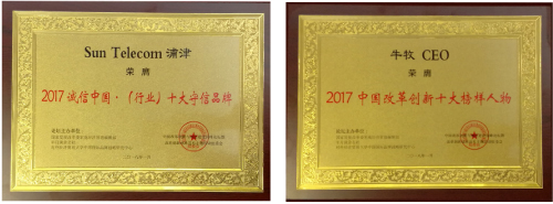 On Jan. 19th 2018, Sun Telecom was awarded as the honorary title of "Trustworthy Brand (Industry) 2017" in Innovation and Integrity Construction Summit 2018 in Beijing, China. And CEO Caesara Niu won the honorary title of "Reform and Innovation Role Model 2017" at the same time.