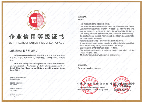 On June. 5th 2020, Sun Telecom was awarded the AAA enterprise credit grade certificate, which is the highest credit rating.